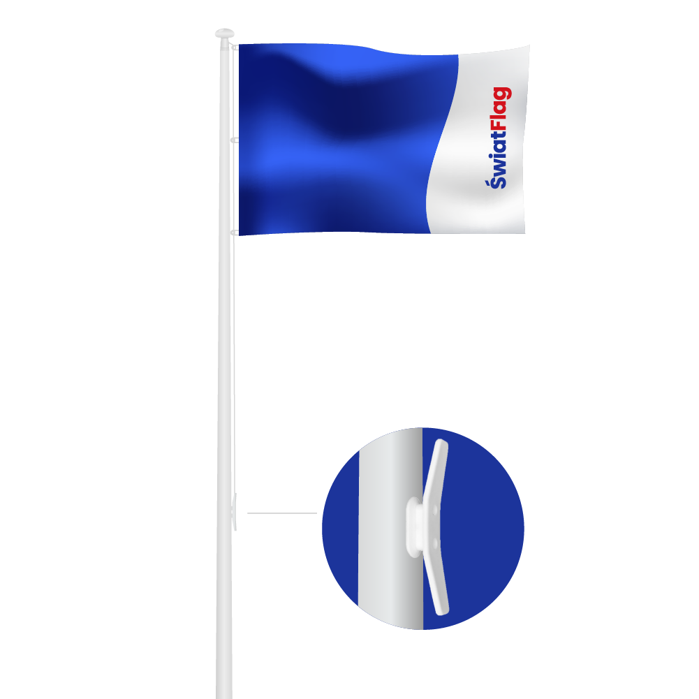 Maszt flagowy włókno wersja Standard z linką na zewnątrz i knagą. W zestawie podstawa uchylna, wyposażenie niezbędne do wciągania flagi i instrukcja montażowa.